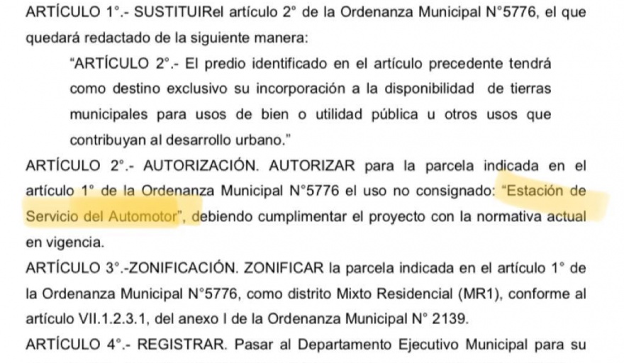El predio ya de desafectó por la Ordenanza Municipal 5776, pero con la intención de sanear el lugar de aguas servidas y roedores. Lo que intenta hacer el Ejecutivo municipal ahora es dejar un destino más amplio, cambiando la categoría de “espacio público” por “espacio para usos de bien o utilidad pública y otros usos que contribuyan al desarrollo urbano”, abriendo así la posibilidad de que se construya la estación de servicio.