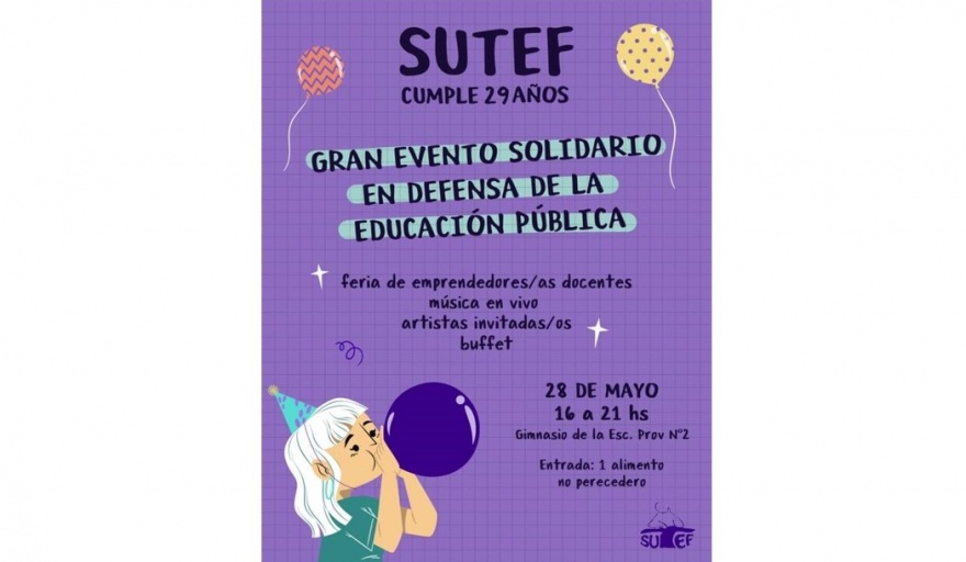 La secretaria General del SUTEF Seccional Río Grande, Adriana Soria, comentó que “En el marco del 29° aniversario del Sindicato Unificado de Trabajadoras y Trabajadores de la Educación Fueguina (SUTEF), organizamos un gran evento solidario en defensa de la educación pública” para mañana sábado.