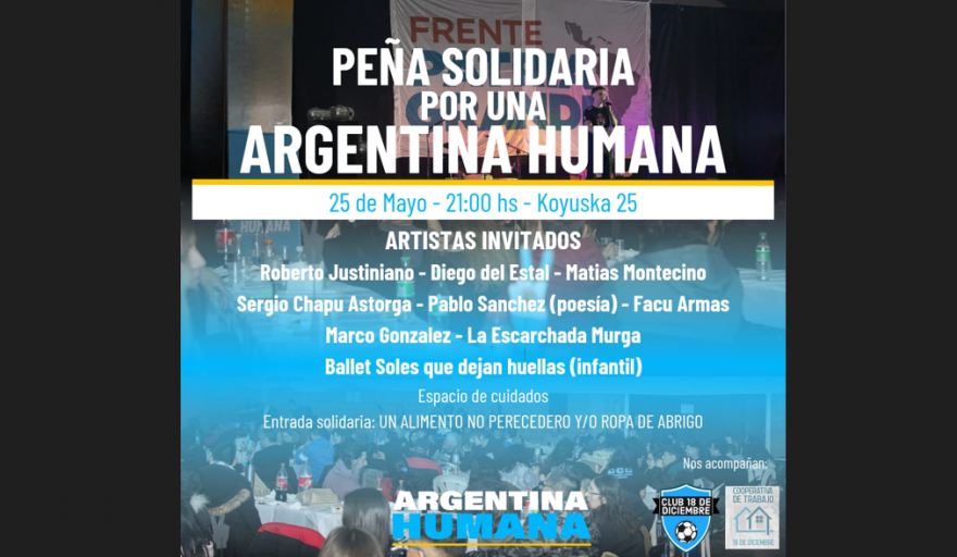 Luego se menciona que “En esta oportunidad organizaremos con los vecinos y vecinas de la Margen Sur una Peña Solidaria este 25 de mayo a las 21 hs en Koyuska 25, para compartir música, comida y alegrías”.