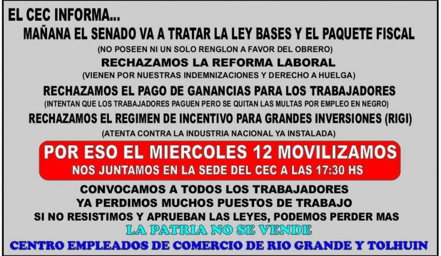 El Centro de Empleados de Comercio de Río Grande está convocando a sus afiliados y afiliadas, para participar de la manifestación que se realizará esta tarde en la esquina de San Martín y Belgrano. En la convocatoria, advierten sobre los perjuicios que generaría la norma si se aprueba.