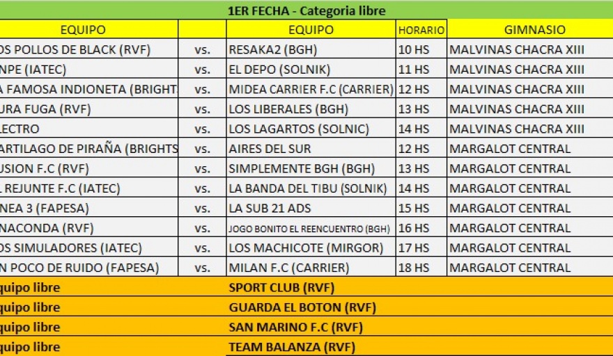 Los partidos correspondientes a la categoría “libre” comenzarán este sábado a partir de las 10 horas en el gimnasio deportivo municipal “Malvinas Argentinas” ubicado en la calle Camilo Giamarini 3419 del ex barrio de Chacra 13 y continuarán el domingo a partir de las 12 horas en el polideportivo municipal “Carlos Margalot” del barrio Chacra 2.