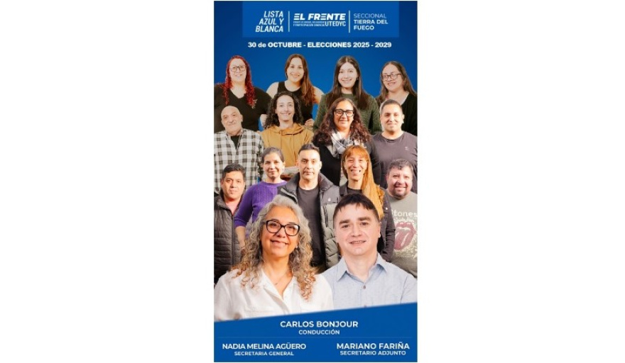 El jueves pasado, afiliadas y afiliados a UTEDyC renovaron las autoridades del gremio. En la provincia, como a nivel nacional, se impuso la lista Azul y Blanca, del Frente de Unidad Solidaridad y Participación Sindical. En Tierra del Fuego el gremio estará encabezado por Nadia Agüero y en el ámbito nacional, por Carlos Bonjour. Agüero ratificó “El compromiso de continuar trabajando para defender los derechos y mejorar las condiciones laborales, de todos los trabajadores que conforman UTEDyC en Tierra del Fuego”.
