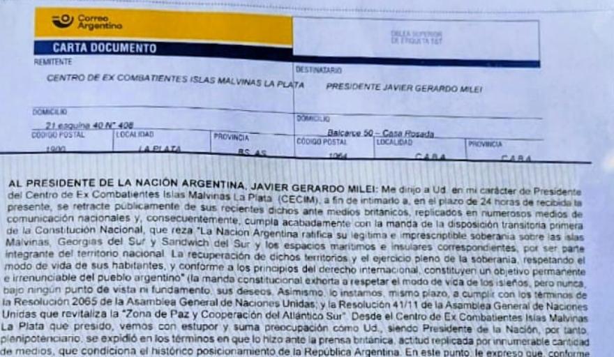 La crisis de soberanía desatada por las declaraciones de Javier Milei al diario británico The Telegraph han pasado de la indignación política a la acción legal directa. Este viernes 2 de enero, el Centro de Ex Combatientes Islas Malvinas (CECIM) La Plata envió una carta documento al Presidente de la Nación, intimándolo a retractarse públicamente de sus dichos en un plazo perentorio de 24 horas.