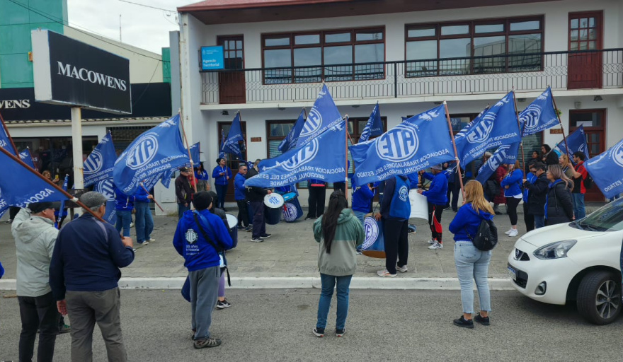 19:10 |En Río Grande, la Asociación Trabajadores del Estado se manifestó frente a la Delegación del Ministerio de Trabajo de la Nación. También hubo expresiones de distintos sectores en la puerta de la empresa Aires del Sur, ocupada por sus trabajadores a raíz del pedido de quiebra de la patronal. En Ushuaia, la convocatoria corrió por parte de la CGT y se concretó frente al puerto.