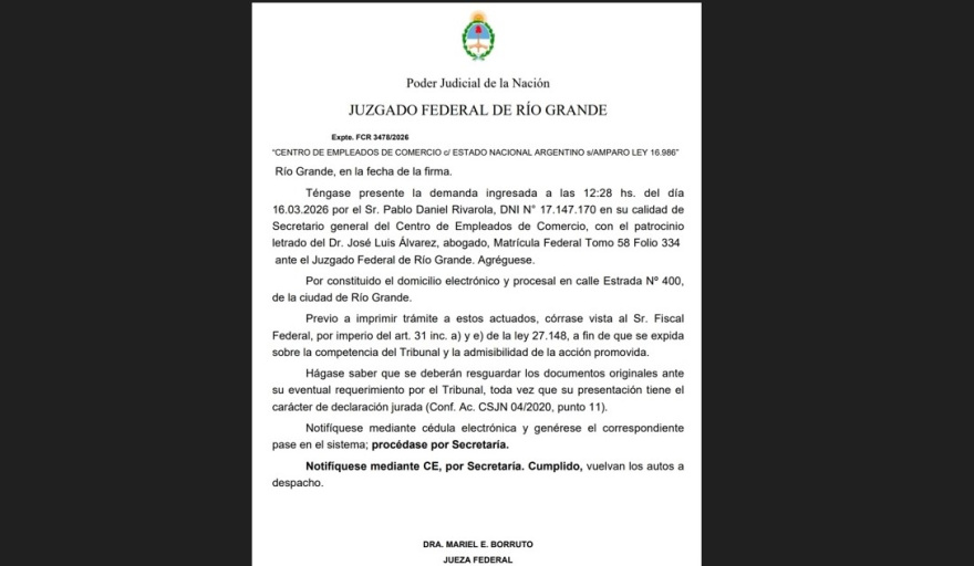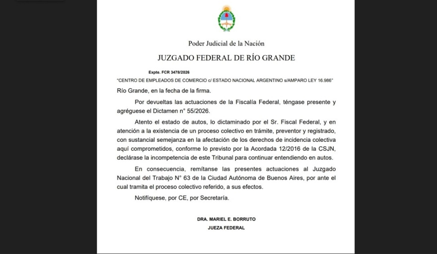 El secretario General del gremio mercantil, después mencionó que “Luego de nuestra presentación, la Sra. jueza (Mariel) Borruto, se expidió de la siguiente manera: Córrase vista al Sr. Fiscal Federal, por imperio del art. 31 inc. a) y e) de la ley 27.148, a fin de que se expida sobre la competencia del Tribunal y la admisibilidad de la acción promovida”. Señalando después que “Transcurridos los días, la Sra. Jueza manifestó que, dadas por devueltas las actuaciones de la Fiscalía Federal: téngase presente y agréguese el Dictamen n° 55/2026. Atento el estado de autos, lo dictaminado por el Sr. Fiscal Federal, y en atención a la existencia de un proceso colectivo en trámite, preventor y registrado, con sustancial semejanza en la afectación de los derechos de incidencia colectiva aquí comprometidos, conforme lo previsto por la Acordada 12/2016 de la CSJN, declárase la incompetencia de este Tribunal para continuar entendiendo en autos. En consecuencia, remítanse las presentes actuaciones al Juzgado Nacional del Trabajo N° 63 de la Ciudad Autónoma de Buenos Aires, por ante el cual tramita el proceso colectivo referido, a sus efectos”, repasó Daniel Rivarola.